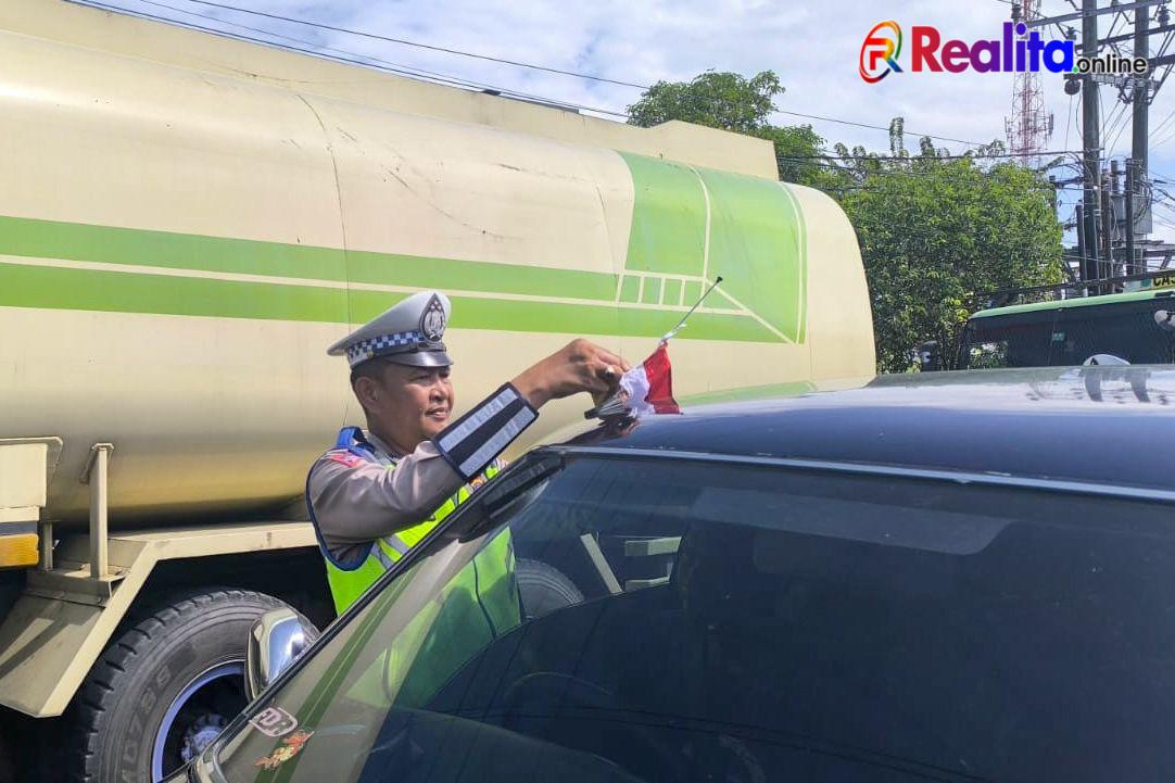 Kegiatan yang dipimpin langsung oleh Kasat Lantas AKP Dela Antomi, S.H., ini merupakan wujud nyata dari upaya Polri untuk membangkitkan kembali semangat nasionalisme dan patriotisme di tengah masyarakat. Para personel kepolisian tidak hanya membagikan brosur imbauan, tetapi juga secara aktif memasangkan bendera Merah Putih di sepeda motor, mobil pribadi, hingga truk yang melintas.