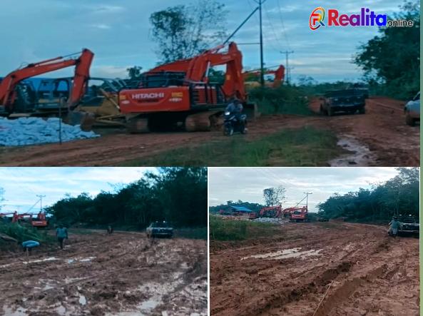 Sangat ironis, di lokasi tersebut terlihat jelas beberapa unit alat berat terparkir dan menganggur, namun jalan yang berada tepat di depan lokasi tersebut dibiarkan penuh lubang dan sangat sulit dilalui.