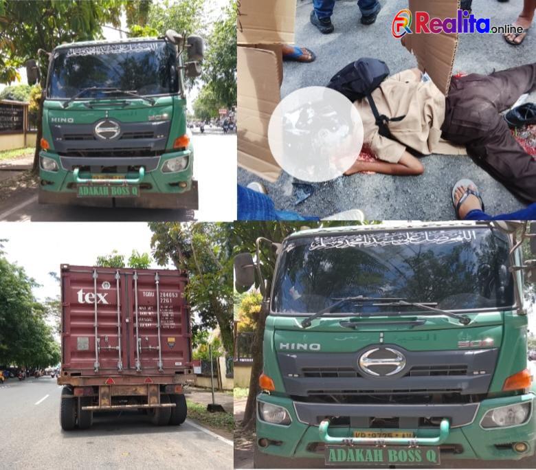 Seorang pelajar yang mengendarai sepeda motor tewas di tempat setelah terlindas truk kontainer.