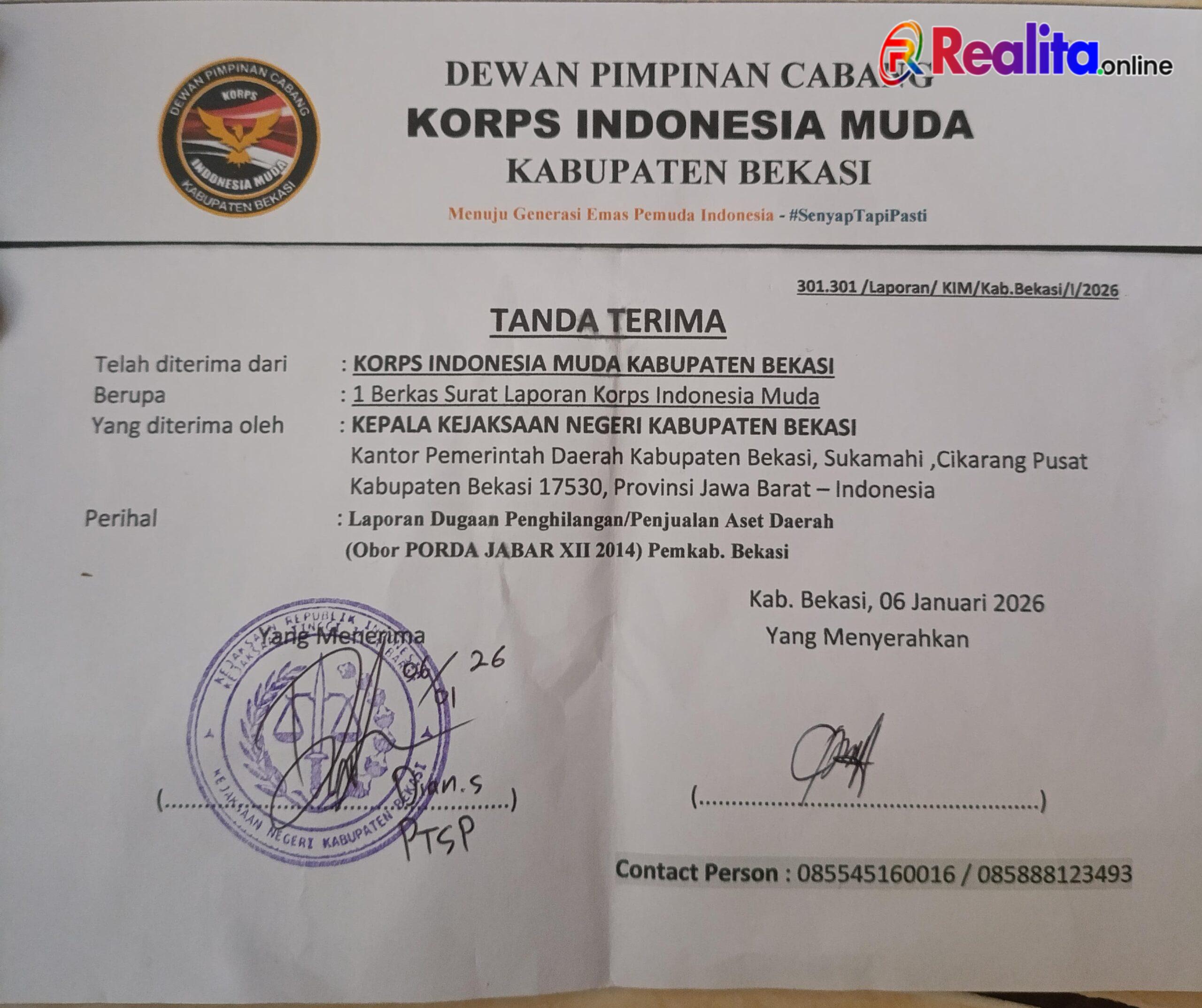 Diketahui Surat Laporan yang dilayangkan KIM Kab. Bekasi Ke Kejaksaan Negeri perihal Dugaan Penjualan Aset yang dilakukan Oknum PNS berinisial AM dari Dinas Disbudpora. Adapun aset daerah yang dijual oleh oknum tersebut berupa Obor Porda Jabar XII 2014. Dengan penjualan tersebut, oknum PNS diduga meraup keuntungan puluhan juta rupiah. Bahkan KIM Kab. Bekasi mendapat informasi bahwa oknum tersebut sudah biasa menjual aset – aset daerah yang disimpan oleh disbudpora di Stadion Wibawa Mukti.