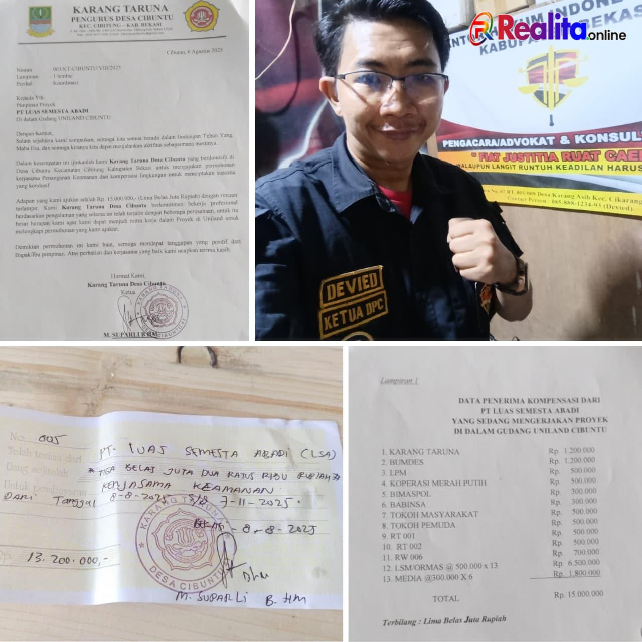Hal itu mencuat setelah beredarnya dokumen surat dan kwitansi bertanda tangan yang mencantumkan penerimaan uang sebesar Rp13.200.000 dari pihak PT Luas Semesta Abadi, perusahaan yang tengah mengerjakan proyek di area Gudang Uniland, Cibuntu.