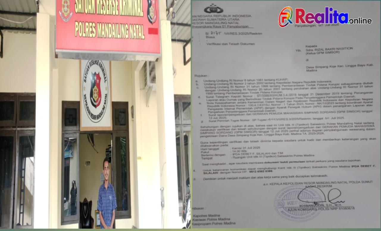 Mandailing Natal, Sumut //Penyelidikan dugaan penyelewengan Dana Desa Simpang Koje, Kecamatan Lingga Bayu, memasuki babak baru. Rizal Bakri Nasution, pelapor kasus ini, memenuhi undangan resmi dari Polres Mandailing Natal pada pukul 14.00 WIB, Rabu (31/7), untuk memberikan keterangan sekaligus menyerahkan sejumlah bukti kuat terkait dugaan penggunaan dana secara fiktif oleh Kepala Desa Simpang Koje, Ahmad Saleh.