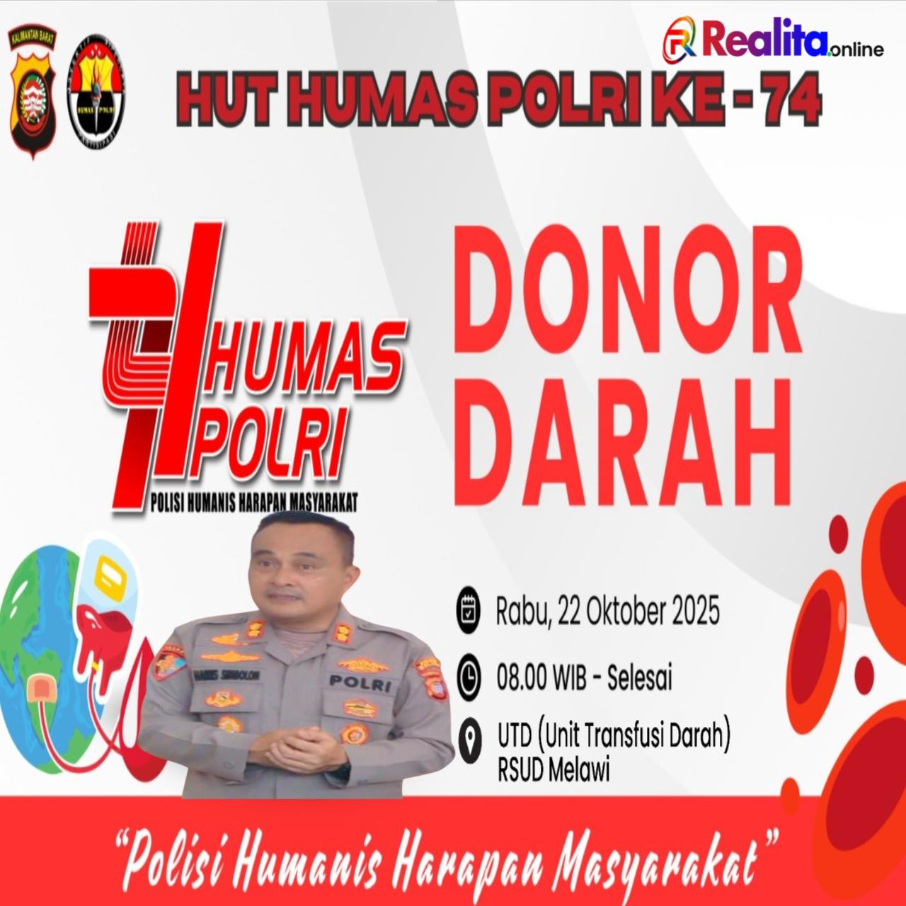 Dalam rangka memperingati Hari Jadi Humas ke-74, Humas Polres Melawi bekerja sama dengan Palang Merah Indonesia (PMI) dan Rumah Sakit Umum Daerah (RSUD) Melawi menggelar kegiatan donor darah. Kegiatan ini akan berlangsung pada hari Rabu, 22 Oktober 2025, pukul 08.00 WIB di RSUD Melawi.