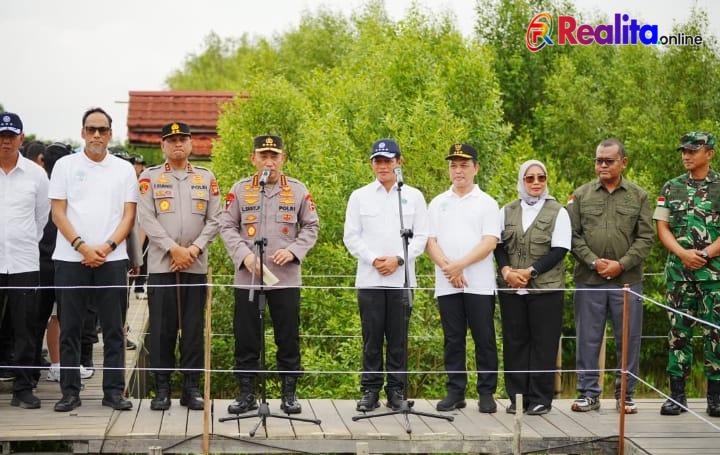 Kapolri Jenderal Polisi Listyo Sigit Prabowo bersama Menteri Lingkungan Hidup dan Kehutanan (LHK) Hanif Faisol Nurofiq melaksanakan kegiatan penanaman hutan mangrove di pesisir Kabupaten Mempawah, Kalimantan Barat, Jumat pagi (8/8).