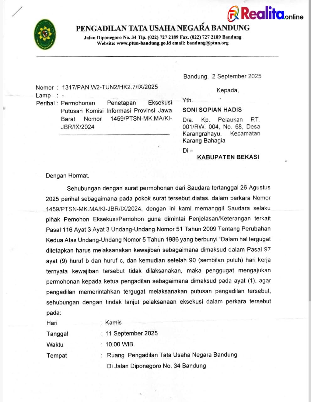 Bandung, Realita.online – Sidang perdana Pengawasan Eksekusi Putusan Komisi Informasi Jawa Barat nomor: 1459/PTSN-MK.MA/KI-JBR/IX/2024 dengan Pemohon Eksekusi Soni Sopian Hadis dan Termohon Eksekusi Pemerintah Desa Karang Anyar, Kecamatan Karang Bahagia, Kabupaten Bekasi, Kamis (11/9/2025).