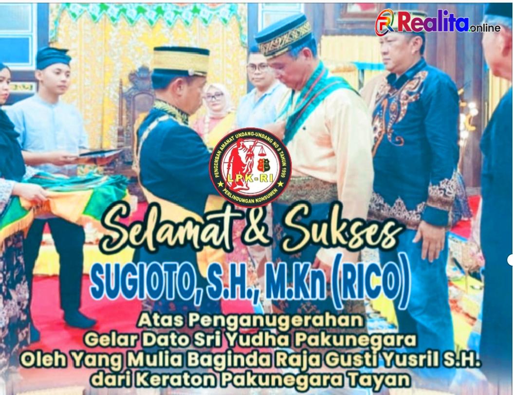 Lembaga Perlindungan Konsumen Republik Indonesia (LPK RI) Kalimantan Barat menyampaikan apresiasi dan ucapan Selamat serta Sukses kepada Bapak Sugioto, S.H., M.Kn atas penganugerahan gelar Dato’ Sri Yudha Pakunegara oleh Yang Mulia Baginda Raja Gusri Yusri S.H dari Keraton Pakunegara Tayan.