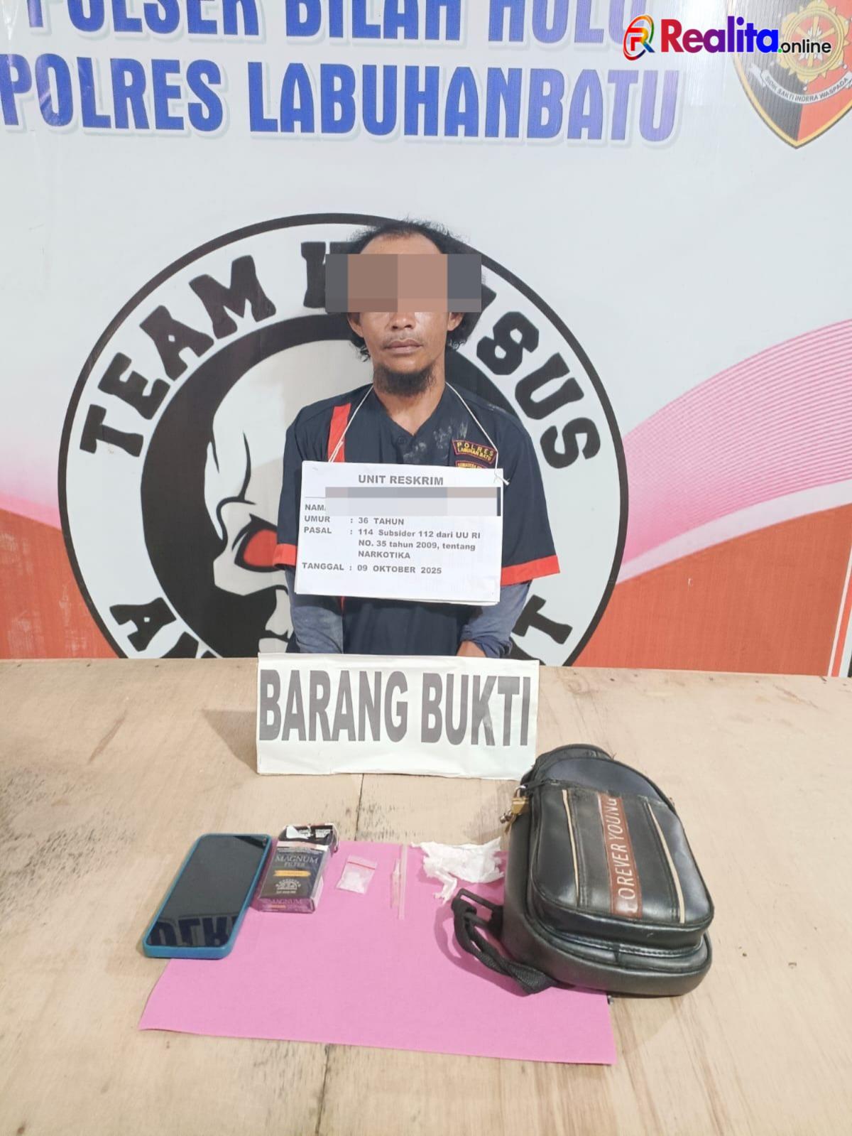 Tim Unit Reskrim Polsek Bilah Hulu Polres Labuhanbatu berhasil mengungkap kasus penyalahgunaan narkotika jenis sabu di wilayah hukumnya. Penangkapan tersebut dilakukan pada Kamis (9/10/25) sekira pukul 21.00 WIB di areal perkebunan PTPN IV Regional I Kanau, Desa N-4, Kecamatan Bilah Hulu, Kabupaten Labuhanbatu. Jumat (10/10/25).
