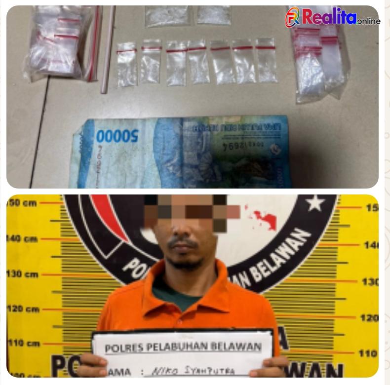 Tersangka yang diamankan adalah Niko Syahputra (34). Dari tangan pelaku, polisi menyita barang bukti berupa 9 plastik klip sabu, 2 pipet ujung runcing, 2 bungkus plastik klip kosong, serta uang tunai Rp 100.000,- yang diduga hasil penjualan narkoba.