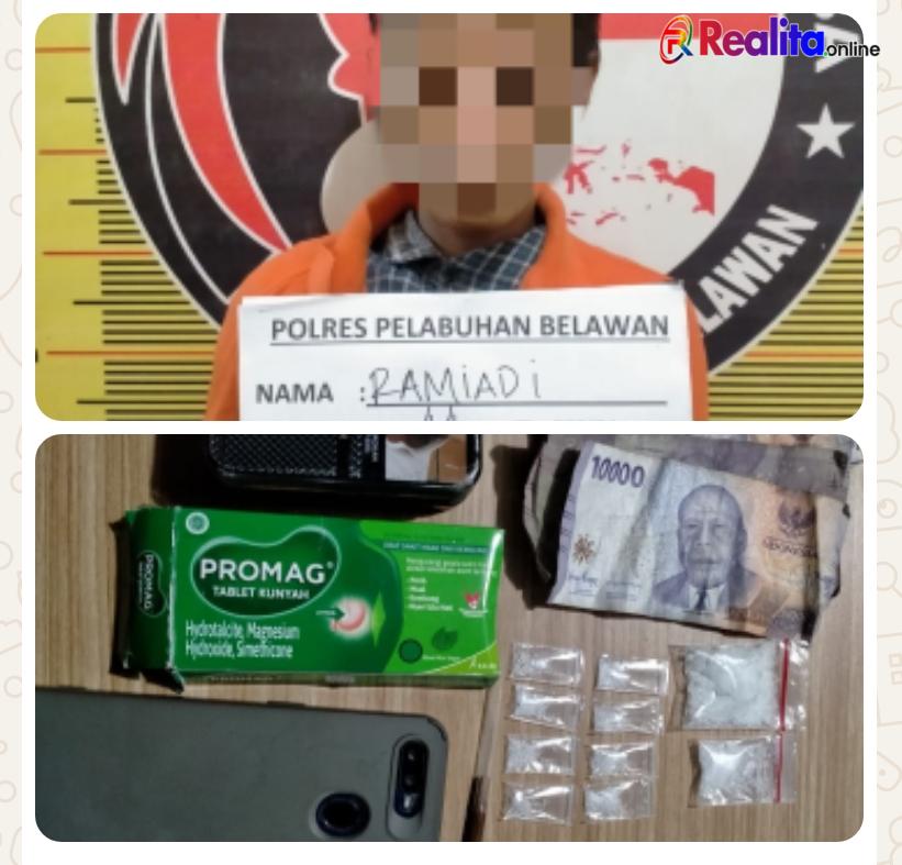 Tersangka yang diamankan adalah Ramiadi (44) dengan barang bukti berupa 10 plastik klip berisi sabu, 1 pipet ujung runcing, 1 bungkus plastik klip kosong, 1 kotak kaleng warna hitam, 1 kotak bertuliskan Promag, 1 unit ponsel, dan uang tunai Rp50.000,-.