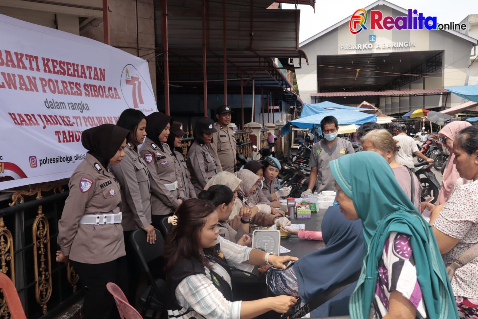 Dalam rangka memperingati Hari Jadi ke-77 Polisi Wanita Republik Indonesia (Polwan RI), Polwan Polres Sibolga menggelar kegiatan Bakti Kesehatan Pengobatan Gratis yang berlangsung di Pasar Kota Baringin, Kamis (28/8/2025).