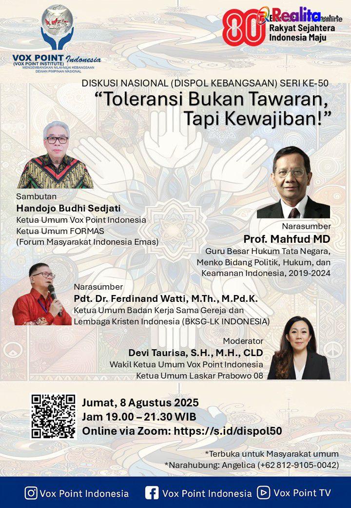 Melalui webinar ini, dengan semangat HUT Ke-80 Republik Indonesia, kita diajak untuk bersama-sama mencari akar masalah dan merumuskan langkah nyata agar intoleransi tidak terus terulang. Mari perkuat komitmen kebangsaan dan wujudkan toleransi sebagai tanggung jawab bersama.